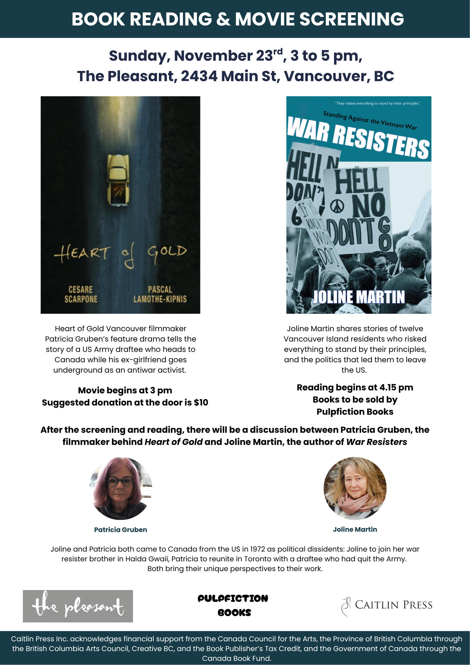 Joline and Patricia both came to Canada from the States in 1972 as political dissidents -- Joline to join her war resister brother in Haida Gwaii, Patricia to reunite with a resister on active duty in Toronto. They recently connected through a mutual friend, who noted their common thread with the common thread in Joline' new book War Resisters: Standing Against the Vietnam War and Patricias' new feature film Heart of Gold. Both projects recall the tumultuous era of resisters arriving in Canada, the extraordinary welcome they received in British Columbia, and their struggles in adjusting to life in exile. They have joined forces on a mini-tour to screen Heart of Gold, launch Joline' book, and meet with former resisters, their communities, and newly energized Canadians standing up for democracy and civil rights.