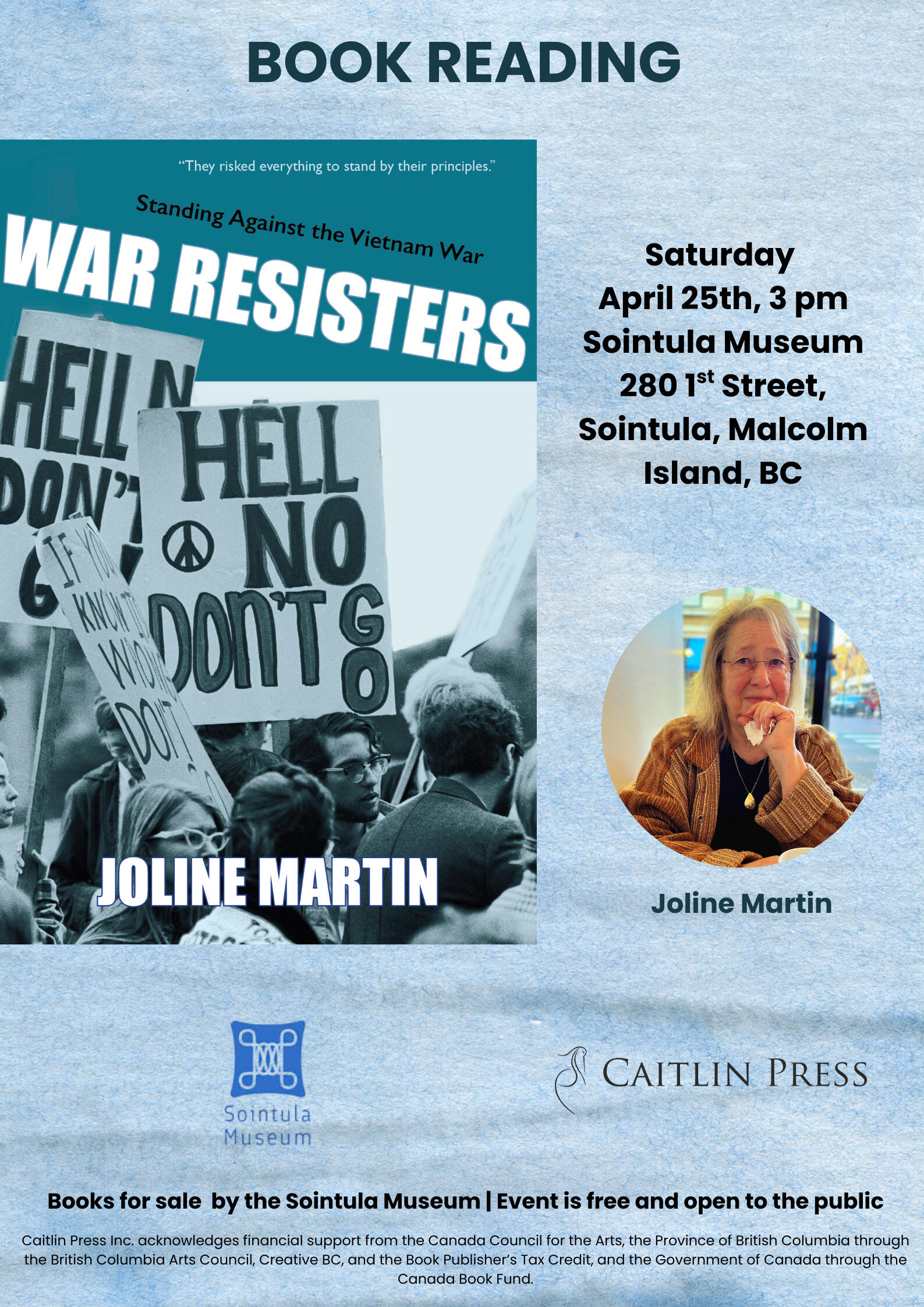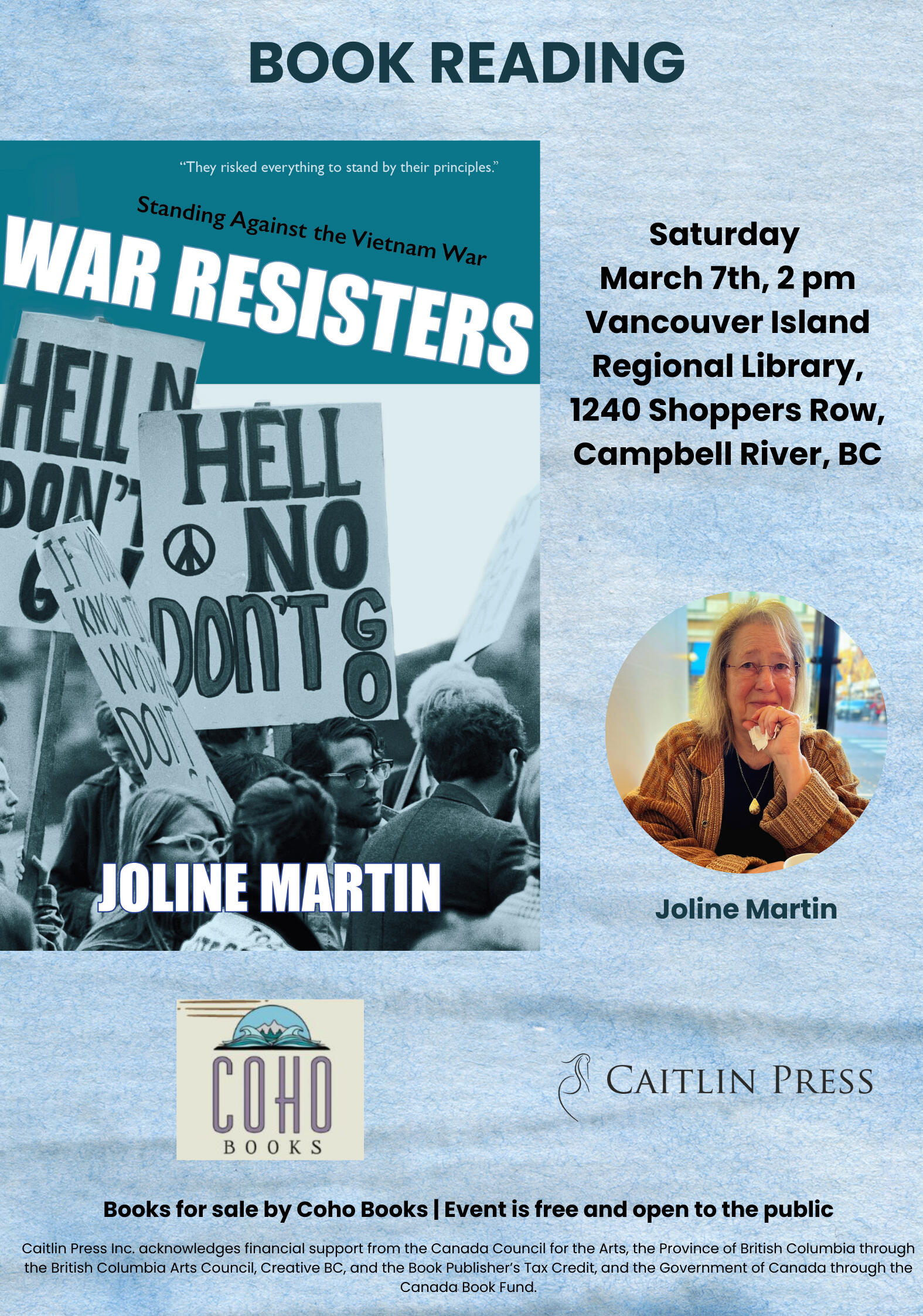 Joline and Patricia both came to Canada from the States in 1972 as political dissidents -- Joline to join her war resister brother in Haida Gwaii, Patricia to reunite with a resister on active duty in Toronto. They recently connected through a mutual friend, who noted their common thread with the common thread in Joline' new book War Resisters: Standing Against the Vietnam War and Patricias' new feature film Heart of Gold. Both projects recall the tumultuous era of resisters arriving in Canada, the extraordinary welcome they received in British Columbia, and their struggles in adjusting to life in exile. They have joined forces on a mini-tour to screen Heart of Gold, launch Joline' book, and meet with former resisters, their communities, and newly energized Canadians standing up for democracy and civil rights.