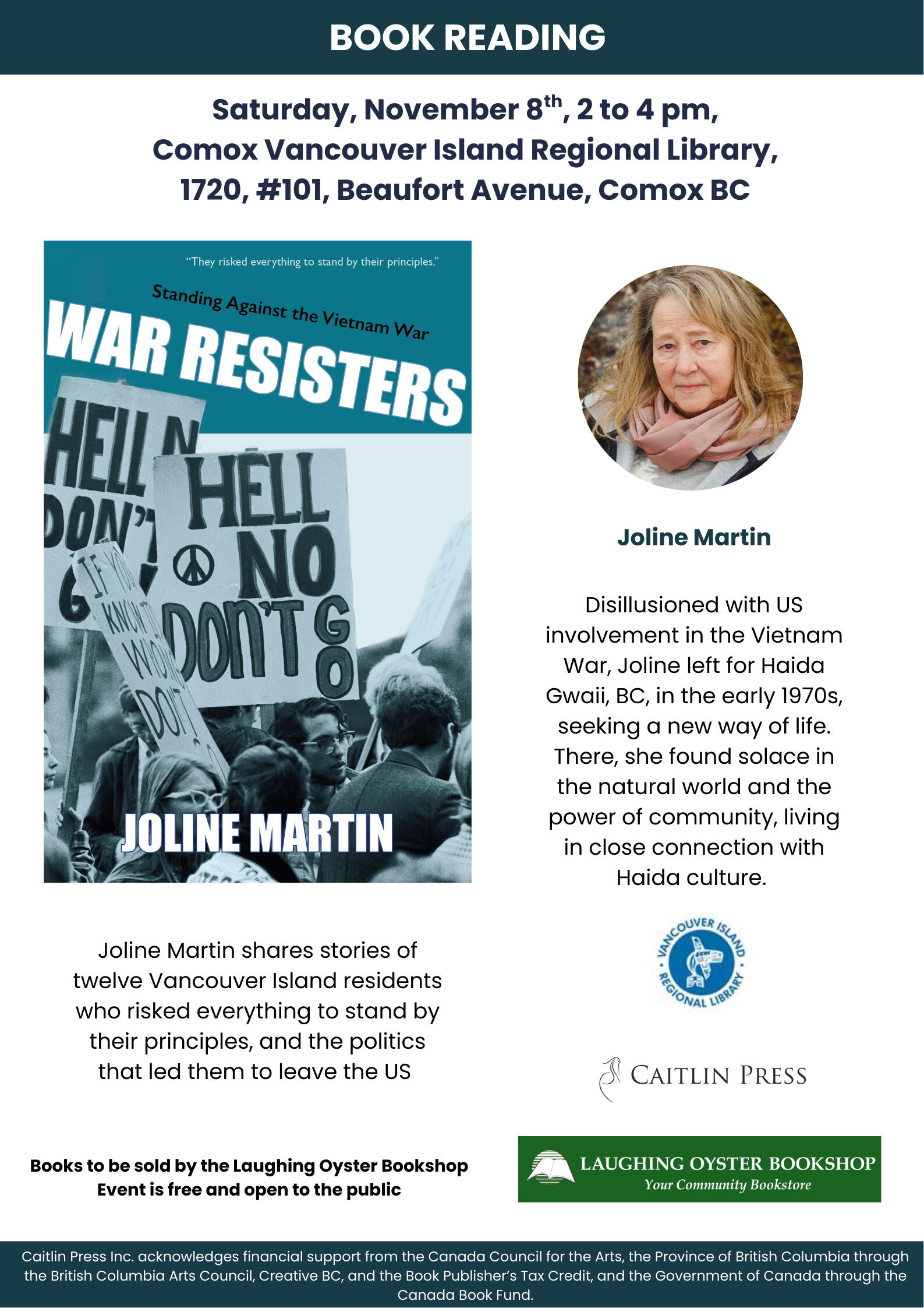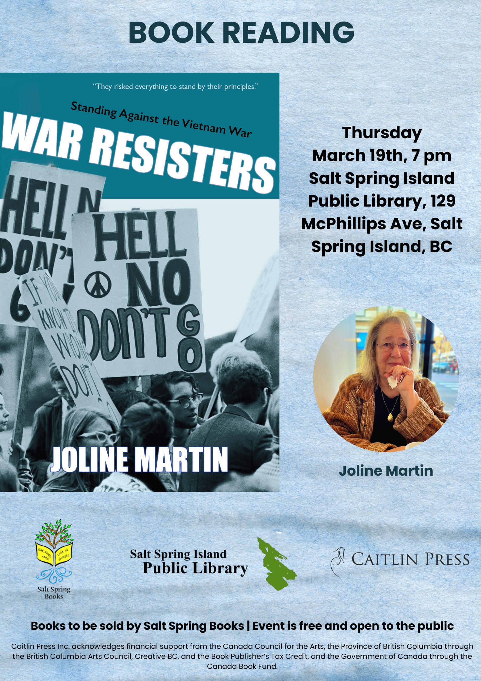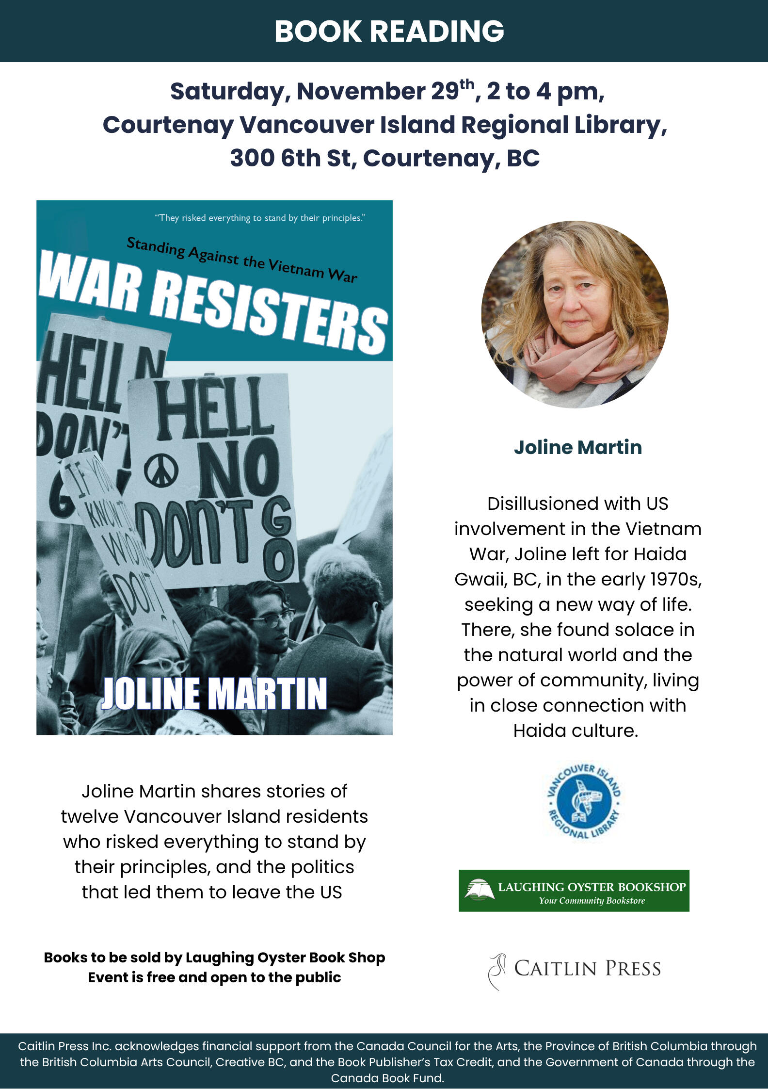 | Many of us who came of age in British Columbia during the Vietnam War knew and often befriended young men and women who escaped the fighting by migrating, often clandestinely, to Canada. In this intimate account, Comox Valley writer Joline Martin uniquely focuses on the draft resisters who came to Vancouver Island and became Canadians. |
